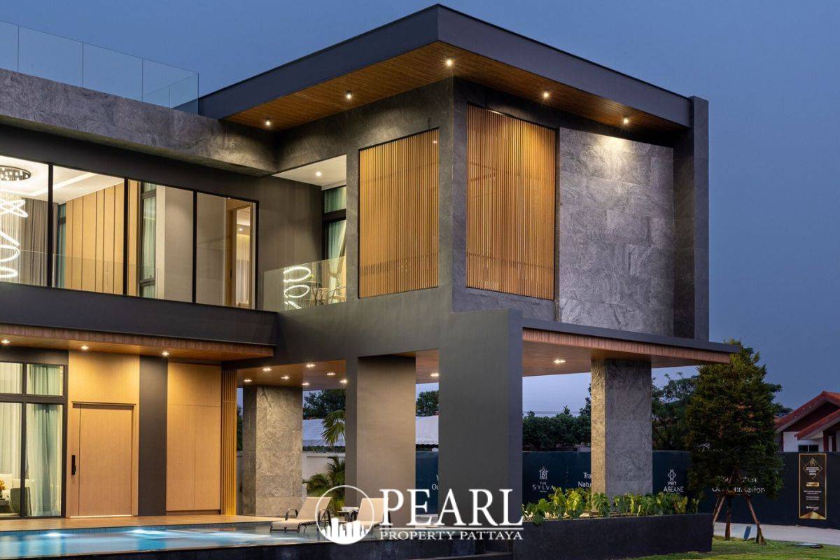 Pearl Property Pattaya proudly presents The Sylva Pattaya, an exquisite collection of eight luxury pool villas nestled within the tranquil embrace of Huai Yai. This exclusive, private gated community, developed by Arneja Estates Co., Ltd., offers discerning international buyers a rare opportunity to experience sophisticated living amidst lush, peaceful surroundings on Huai Yai Road (Tetsaban Soi 27). The Sylva Pattaya embodies a seamless blend of upscale modern contemporary design, unparalleled privacy, and a deep connection to nature, promising an idyllic sanctuary just moments from Pattaya’s vibrant heart. Each of the eight meticulously designed villas offers a generous 705 square meters of usable area, set upon expansive land plots ranging from 555.88 to 658.68 square meters. These impressive residences are thoughtfully laid out over three levels, featuring 5+1 bedrooms, seven bathrooms, and a dedicated maid's room. The interiors boast double-volume living rooms, a state-of-the-art European kitchen complete with an island and separate spice kitchen, a lounge bar, utility room, and ample storage space. Outdoors, residents will delight in a private saltwater infinity pool, beautifully landscaped gardens, spacious terraces, and a rooftop deck, all complemented by covered parking for up to three cars. The Sylva Pattaya is designed for a lifestyle of comfort and security, featuring 24-hour security, CCTV surveillance throughout the gated estate, and smart home integration for enhanced convenience. While offering a serene escape, the development remains exceptionally well-connected. Residents will enjoy easy access to Pattaya's premier attractions, including the pristine Jomtien Beach, the charming Pattaya Floating Market, world-class golf at Siam Country Club, and family-friendly destinations like Nong Nooch Garden and Ramayana Water Park. Educational needs are also met with the nearby French International School. The Sylva Pattaya is currently under construction with an expected completion in Q4 2026, inviting you to discover a life where luxury meets serenity.