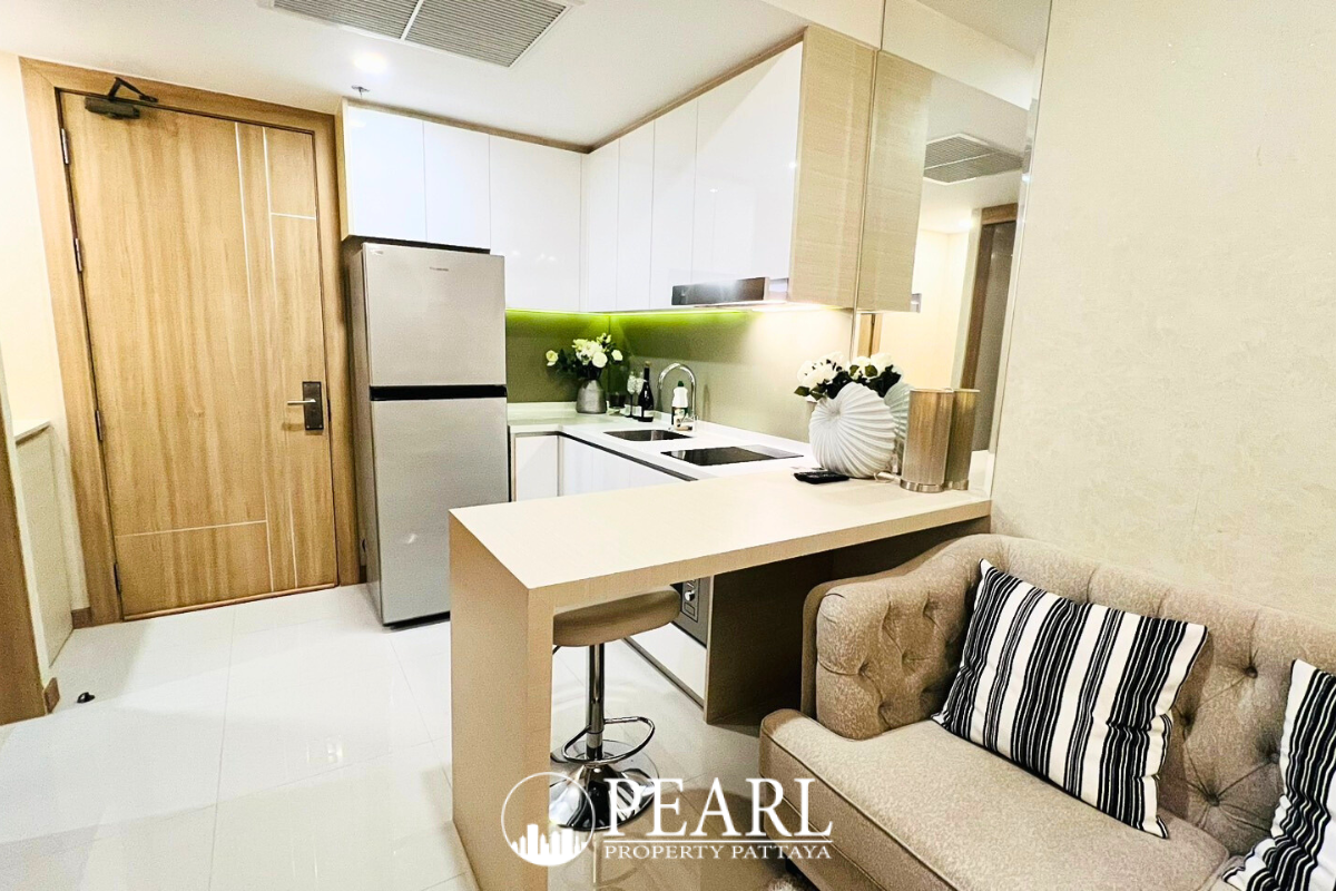 Discover unparalleled luxury and sophisticated living at The Riviera Jomtien with this exquisite one-bedroom, one-bathroom condominium, perfectly situated in one of Pattaya's most prestigious high-rise developments. Spanning a comfortable 34 square meters, this residence offers a meticulously designed modern living space, featuring high-quality finishes that maximize both comfort and style. From the moment you step inside, you'll be captivated by the panoramic sea and city vistas, providing a breathtaking backdrop to your everyday life. The prime location places you a mere 200 meters from the pristine sands of Jomtien Beach, inviting you to embrace an unparalleled beachside lifestyle. The Riviera Jomtien is renowned for its exceptional amenities, designed to cater to every desire. Indulge in the awe-inspiring experience of two cantilevered infinity-edge sky pools, majestically perched on the 37th and 42nd floors, offering truly panoramic views. Maintain your wellness routine with access to state-of-the-art gymnasiums located on both the 7th and 42nd floors, complemented by luxurious sauna and steam rooms. Beyond these elevated sanctuaries, the development boasts a ground floor lagoon pool, beautifully landscaped gardens, a dedicated children's playground, and an elegant sky lounge, providing ample opportunities for relaxation and socializing within a vibrant community. As a resident of this award-winning development, you'll enjoy a dynamic urban experience, with convenient access to an array of shopping centers, diverse dining establishments, and exciting entertainment venues. This condominium offers more than just a home; it presents an opportunity to immerse yourself in a trend-setting lifestyle, recognized for its architectural excellence and design innovation. Priced at ฿3,700,000, this is an exceptional chance to own a piece of luxury in one of Pattaya's most sought-after addresses.