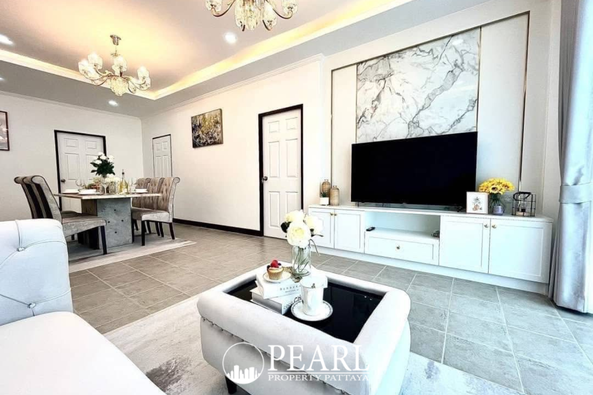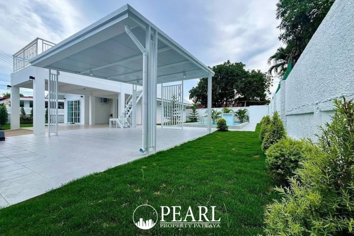 Discover unparalleled luxury and convenience with this exquisite 3-bedroom, 3-bathroom pool villa, perfectly situated in the heart of Soi Siam Country Club, East Pattaya. This newly renovated, fully furnished residence offers a resort-style living experience, mere minutes from Mitkamol Intersection and a wealth of essential amenities. Spanning an impressive 440 square meters of land, this single-story detached home provides ample space and privacy, making it an ideal sanctuary for discerning international buyers or renters. The villa boasts a bright and airy living area that seamlessly connects to a lush, private garden and a sparkling swimming pool, complete with an overflow system and sun deck for ultimate relaxation. The fully equipped kitchen and dedicated utility space cater to all your culinary needs, while four air-conditioning units ensure comfort throughout. Enjoy the convenience of covered parking for 3-4 cars, protected by a durable steel-roof structure. A standout feature is the expansive rooftop terrace, offering panoramic views—a perfect setting for memorable sunset gatherings or a private sky lounge. This turnkey property comes complete with a TV, refrigerator, water heater, and all essential furniture, ensuring a seamless move-in experience. Embrace a lifestyle of tranquility and accessibility in this peaceful yet exceptionally convenient neighborhood. The property’s prime location offers easy access to Central Pattaya, allowing you to enjoy the vibrant city life while returning to your private oasis. With its blend of modern amenities, spacious design, and a coveted address, this villa represents an exceptional opportunity for those seeking a premium home in Pattaya.