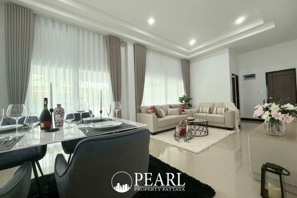 Pearl Property Pattaya is delighted to present an exceptional opportunity to own a beautifully maintained 3-bedroom house in the serene community of Pronthep Garden 5, Nongplalai, Banglamung. This single-storey residence, set on a generous 216 square meters of land with a practical 139 square meters of usable living space, offers a perfect blend of comfort and convenience. Fully furnished and ready for immediate occupancy, it features a spacious living and dining area, a modern European-standard kitchen equipped with quality appliances, three well-appointed bedrooms, and two bathrooms. The property also boasts a charming terrace, a private garden ideal for relaxation, and covered parking for two vehicles, ensuring a comfortable and secure lifestyle for families or retirees. Residents of Pronthep Garden 5 benefit from a host of desirable amenities designed to enhance daily living. The community provides 24-hour security for peace of mind and access to a common swimming pool, perfect for leisure and recreation. With a remarkably low maintenance fee of just 600 THB per month, this property offers an affordable luxury lifestyle. Its prime location in a tranquil residential area ensures easy access to essential services, including local shops, cafes, and restaurants, as well as an international school and a hospital, all within close proximity. This charming home offers the best of both worlds: a peaceful retreat from the bustling city, yet with excellent connectivity to Pattaya's vibrant center. Whether you are seeking a permanent family residence or a tranquil haven for your retirement years, this property provides an ideal setting for a relaxed lifestyle without compromising on urban conveniences. Do not miss the chance to acquire this warm, move-in-ready home in one of Chonburi’s most desirable communities. Contact Pearl Property Pattaya today to schedule a personal viewing or arrange a virtual tour.