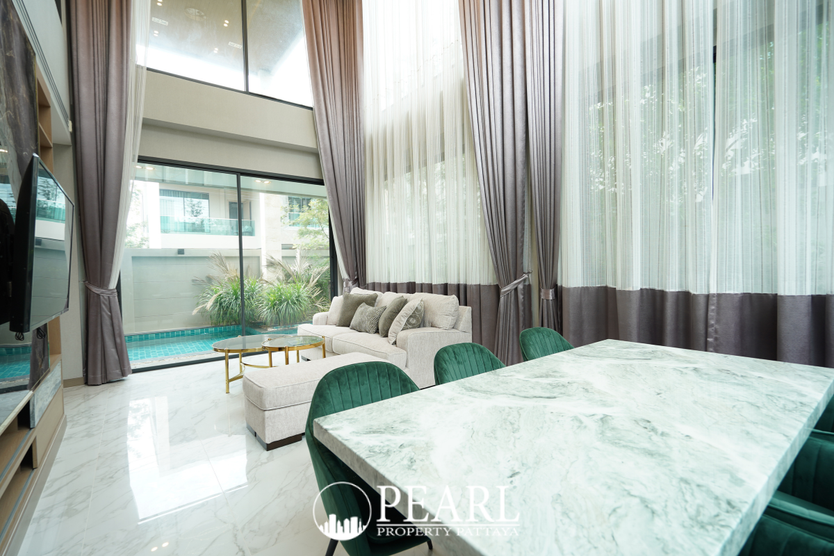 Discover unparalleled luxury and modern living in this exquisite 3-bedroom, 4-bathroom pool villa, nestled within the prestigious Madcha Nirvana development in Pattaya's serene Huai Yai district. This contemporary two-story residence offers a generous 282 square meters of sophisticated design, perfectly blending spacious interiors with cutting-edge smart home technology. Imagine effortlessly controlling your lighting, air conditioning, and security systems, all from the palm of your hand, providing both convenience and peace of mind. Step inside to an expansive open-plan living and dining area, complemented by soaring ceilings over 8 meters high, creating an airy and inviting atmosphere. The villa boasts both a fully equipped European kitchen and a traditional Thai kitchen, catering to every culinary desire. Each of the three bedrooms features its own en-suite bathroom, ensuring privacy and comfort for all residents. Outside, a private saltwater swimming pool with an integrated Jacuzzi awaits, offering a tranquil oasis for relaxation and entertainment. The property is fully furnished with premium materials and finishes, reflecting an uncompromising commitment to quality, and includes covered parking for two vehicles, alongside a sophisticated smart home system with wireless CCTV and a remote-controlled gate. Strategically located, this magnificent home offers the best of both worlds: a peaceful retreat just a 10-minute drive from the vibrant shores of Jomtien Beach and a mere 15 minutes from the bustling heart of Pattaya City. With easy access to Motorway 7, residents benefit from seamless connectivity to international schools, world-class shopping centers, and a plethora of local attractions, making it an ideal choice for discerning international buyers seeking a luxurious and convenient lifestyle in Thailand.