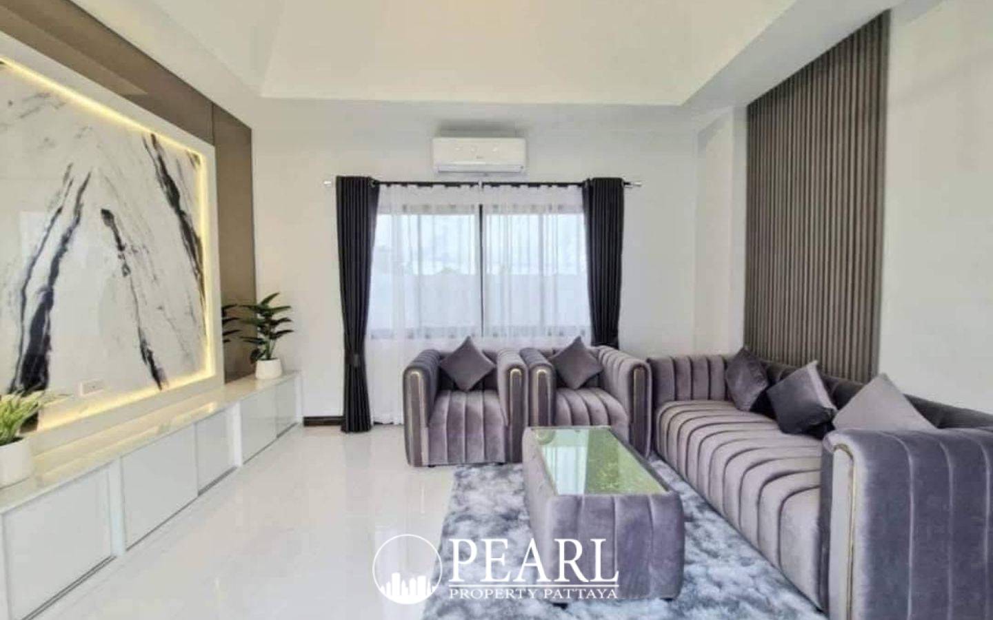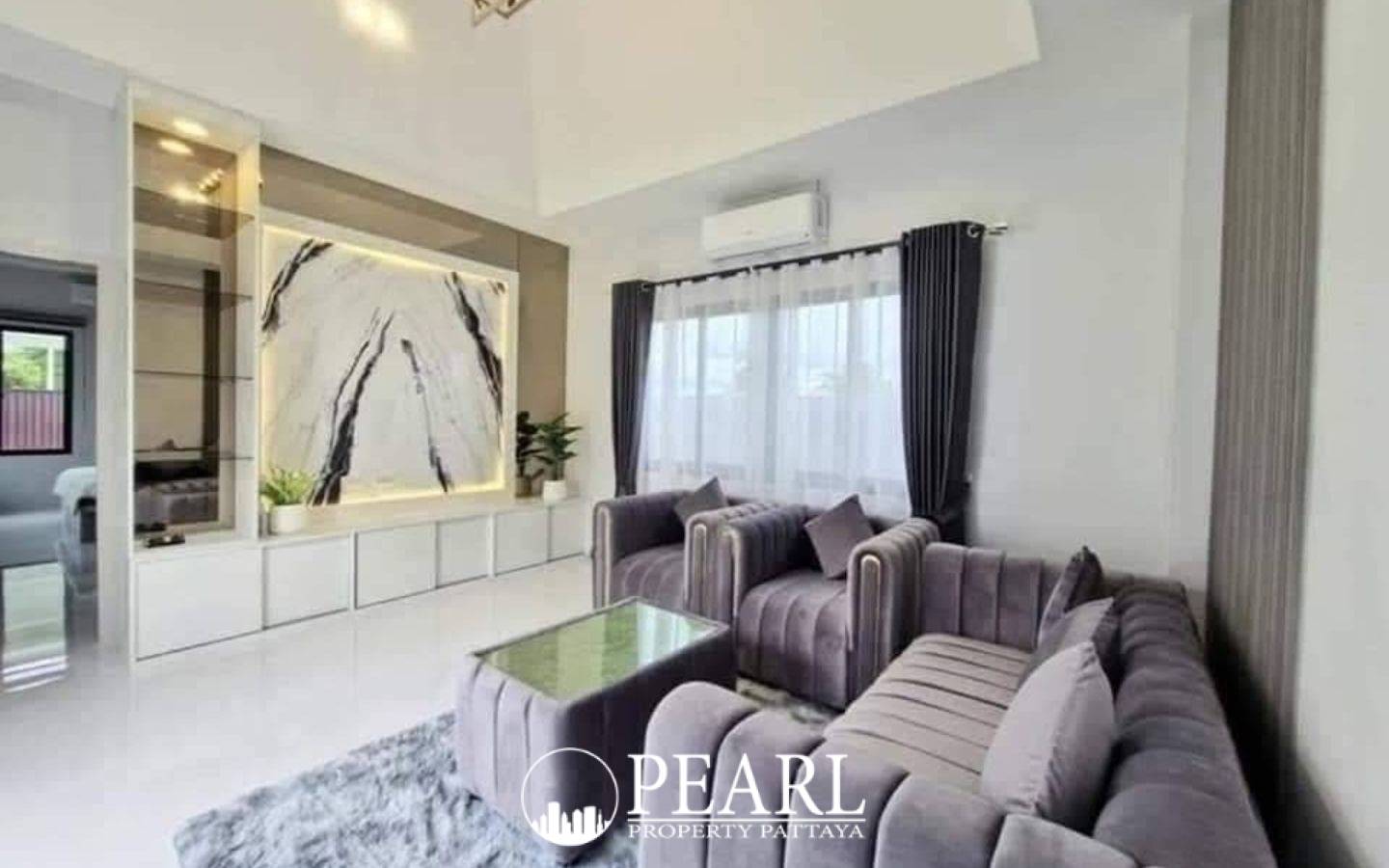 Discover unparalleled tranquility and convenience in this newly constructed 3-bedroom, 3-bathroom private house, ideally situated in a serene enclave of East Pattaya. This exquisite residence offers the perfect balance of peaceful living with effortless access to the vibrant heart of Pattaya. Just a short drive from the picturesque Chak Nok Lake, residents can enjoy a tranquil environment while remaining close to the city's dynamic attractions. The surrounding area boasts a wealth of amenities, including esteemed international schools, championship golf courses, diverse dining options, and an array of shopping destinations, making this an exceptional choice for discerning families and individuals seeking a sophisticated lifestyle. This charming villa, encompassing 140 square meters of thoughtfully designed living space on a generous 100 square wah (400 sqm) plot, is offered fully furnished for immediate enjoyment. The interior features a stylish European-style kitchen, perfect for culinary enthusiasts, alongside a comfortable dining area ideal for intimate meals or entertaining guests. Step outside to your private oasis, where a refreshing swimming pool awaits, offering a perfect retreat for relaxation and social gatherings. Additionally, ample parking space is provided for your convenience, completing this exceptional offering from Pearl Property Pattaya.