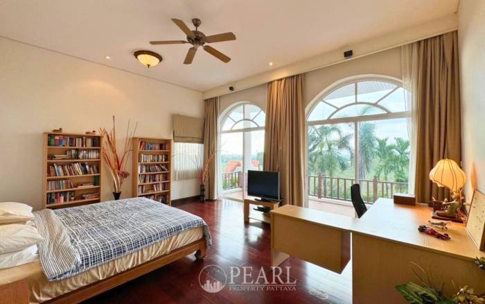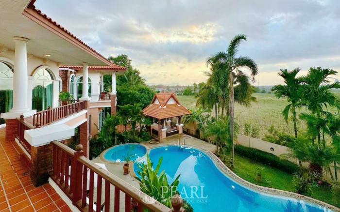 Discover an unparalleled sanctuary at Phoenix Gold Golf and Country Club with this exquisite 4-bedroom residence, now available through Pearl Property Pattaya. This exceptional property, encompassing a generous 1796 square meters, offers the ultimate blend of privacy, elegance, and comfort within one of Pattaya's most prestigious locations. Priced at ฿36,000,000, this home is a testament to luxurious living, meticulously designed to cater to the most discerning international buyers. Step into a world where every detail has been considered. The grand private pool and soothing jacuzzi provide an idyllic setting for relaxation and entertaining, while an elegant wine cellar offers a refined space to curate your collection. The property’s exterior is further enhanced by a charming aviary and picturesque tropical ponds, creating a tranquil, natural ambiance. Inside, the home boasts four spacious bedrooms, a versatile study, and three luxurious en-suite bathrooms, complemented by an additional guest toilet for convenience. A traditional Sala Thai adds a touch of cultural charm, and a striking large aquarium serves as a captivating centerpiece, seamlessly integrating with the vibrant tropical paradise views from every room. Experience ultimate convenience with a private elevator providing direct access to the master bedroom, ensuring both privacy and ease. This residence is a masterpiece of design, conceived by a renowned hotel architect and surrounded by lush gardens curated by a distinguished professor of landscape architecture. The exceptional build quality and aesthetic beauty are evident throughout, offering a sophisticated and comfortable lifestyle. This is more than just a home; it's a private retreat designed for those who appreciate the finer things in life in Central Pattaya.