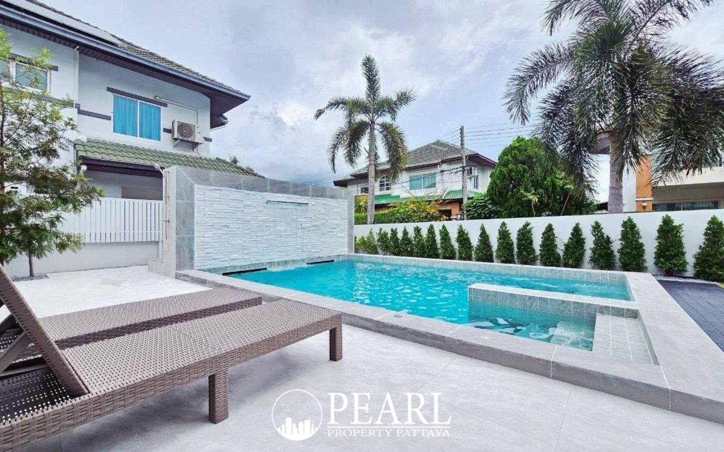 Pearl Property Pattaya proudly presents an exceptional executive home within the esteemed Green Field Villas 2, offering luxurious living in East Pattaya. This fully furnished, move-in ready private pool villa is nestled in the heart of Khao Noi, a desirable area known for its tranquility and accessibility. Spanning a generous 464 square meters of land, this residence boasts four spacious bedrooms and five well-appointed bathrooms, providing ample comfort and privacy for families or those seeking an expansive retreat. The property features a private 3x7 meter swimming pool, inviting residents to enjoy a resort-like lifestyle from the comfort of their own home. Green Field Villas 2 is a prestigious, well-established community completed in 2009, comprising only 59 exclusive homes. Residents benefit from comprehensive communal facilities, including a large swimming pool, a fully equipped fitness center, beautifully landscaped gardens, and round-the-clock security, ensuring peace of mind. The villa itself is meticulously furnished with high-quality built-in furniture throughout, complemented by four air-conditioning units and a full set of curtains. The fully equipped European kitchen features a gas stove, extractor, and refrigerator, making it ready for immediate use. This prime location in Nong Prue, Bang Lamung, Chonburi, offers unparalleled convenience. It is ideally situated near Regent's International School and provides effortless access to major highways, Route 7 and Route 36, facilitating quick and convenient travel to central Pattaya and Bangkok. This property represents an outstanding opportunity for international buyers seeking a luxurious, secure, and well-connected home in Pattaya. Don't miss the chance to acquire this stunning pool villa for 15,900,000 THB, with transfer fees shared 50/50. Contact Pearl Property Pattaya today to arrange a private viewing or virtual tour.