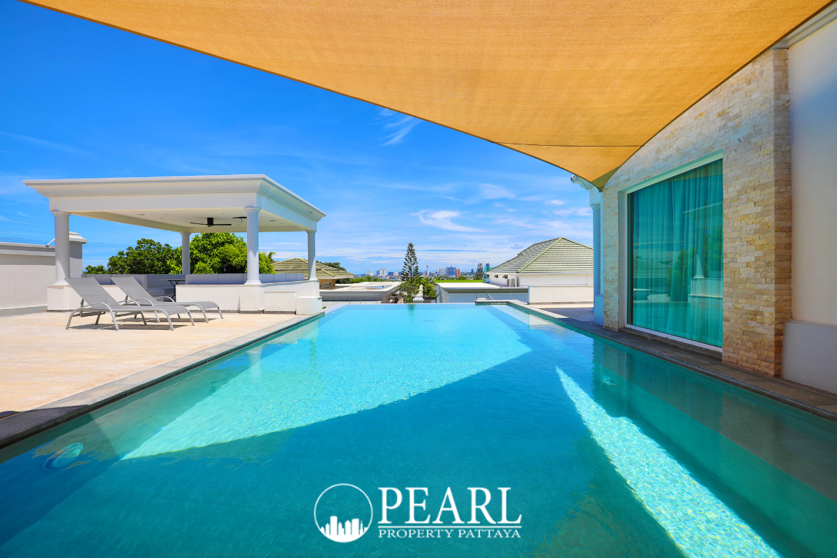 Experience unparalleled luxury at this exquisite four-bedroom, five-bathroom pool villa, nestled within the highly coveted Siam Royal View estate. This magnificent property offers breathtaking panoramic sea and city views, a rare and highly sought-after feature in Pattaya's luxury real estate market. Spanning an impressive 1,050 square meters of land with a meticulously designed 478 square meters of living space, this residence epitomizes sophisticated tropical living. The main level is an entertainer's dream, featuring an elegant open-plan living and dining area complemented by a fully equipped Western kitchen. For relaxation, indulge in the formal TV lounge or unwind in the cozy secondary media corner. Three generously sized bedrooms, each with its own en-suite bathroom, provide ultimate comfort and privacy. Step outside to an expansive terrace, perfect for al fresco dining, complete with a plush sala and a sun deck. The stunning 11 x 5 meter infinity pool invites you to cool off while soaking in the spectacular vistas. Practical amenities on this level include a double garage, a dedicated storage room, and a convenient laundry area. Descend to the lower level to discover a private sanctuary. Here, a fourth bedroom with an en-suite bathroom offers an ideal retreat for guests or extended family. This level also boasts a second plunge pool, beautifully integrated into lush gardens, providing an additional serene space for relaxation and enjoyment. Located within one of Pattaya’s most exclusive gated communities, this villa seamlessly blends privacy, expansive space, and some of the most captivating views the city has to offer. Whether envisioned as a peaceful private residence or a lavish holiday escape, this property promises an exceptional lifestyle of comfort and prestige.