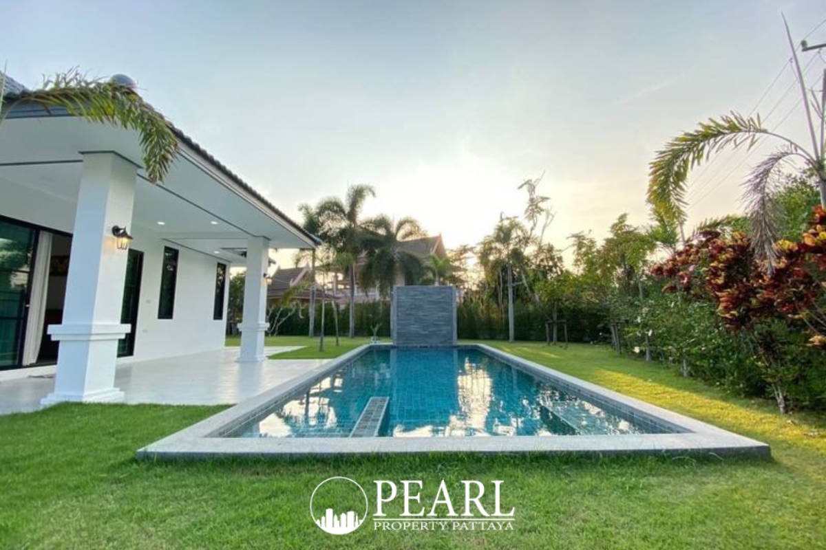 Discover an exquisite lakeside retreat at The Lantern – Mabprachan, a rare gem offering unparalleled serenity and modern luxury. This exceptional single-story residence presents a harmonious blend of contemporary elegance and timeless appeal, meticulously designed for discerning international buyers seeking a sophisticated lifestyle in Pattaya. Spanning an impressive 844 square meters of land with a spacious 265 square meter living area, this home features four generously sized bedrooms and four well-appointed bathrooms, each thoughtfully crafted for ultimate comfort and modern living. The interior boasts a stylish European-style kitchen, a dedicated dining area perfect for entertaining, and comes fully furnished and air-conditioned throughout. Pet owners will appreciate the pet-friendly environment, all set against picturesque views of your private swimming pool. Step outside to your personal oasis, complete with a sparkling private swimming pool, an expansive garden, and ample car parking. Shady trees provide a tranquil ambiance, while a dedicated garage and a charming balcony offer ideal spaces for both relaxation and entertaining. A significant advantage of this property is the absence of communal fees, ensuring you enjoy full ownership of your luxurious retreat without shared maintenance costs. The ownership structure is held under a Thai company, simplifying the transfer process and providing legal clarity. Offered fully move-in ready, this residence awaits your personal touches to transform it into your dream home. Nestled between the tranquil Mabprachan Lake and the prestigious Horseshoe Point in East Pattaya, The Lantern is an exclusive enclave comprising just seven homes. This ensures a peaceful and private retreat, offering a lifestyle of prestige and convenience. Experience the best of Pattaya living, where natural beauty meets modern comfort in this truly remarkable property.