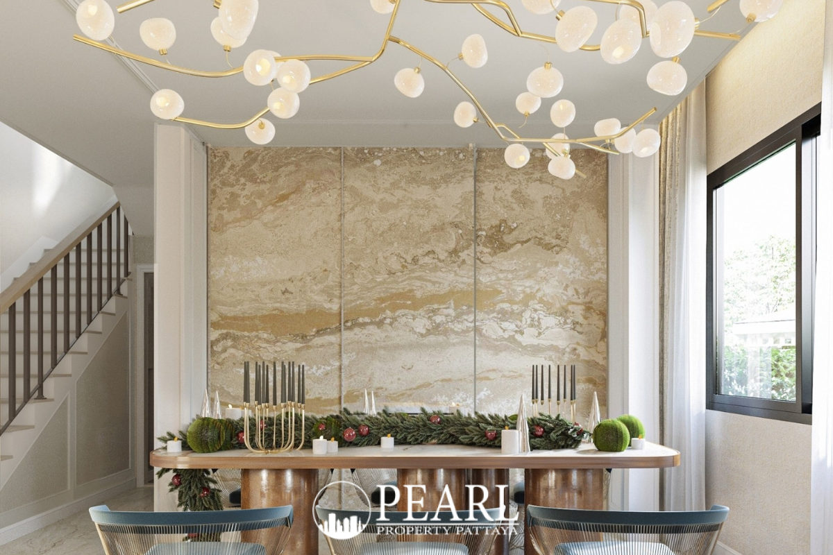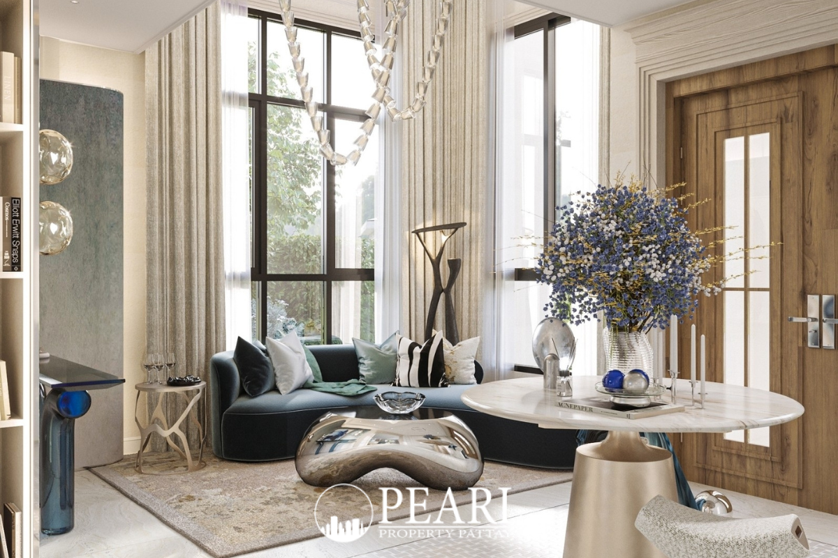 Discover an exceptional opportunity at The Palm Grandio's, an elegant 4-bedroom, 5-bathroom detached house nestled within the serene Nong Pla Lai area of Pattaya. This exquisite residence, part of a refined gated community completed in April 2025, offers a sophisticated lifestyle for discerning international buyers. Spanning 252 square meters on a 63 square meter land plot, this two-story home provides ample space for comfortable family living. It features four spacious bedrooms and five modern bathrooms, alongside a large main living area complemented by two separate private zones, ideal for a home office or dedicated relaxation spaces. Practical amenities include three dedicated parking lots and an on-site EV charger, catering to modern needs. Residents of The Palm Grandio's will enjoy a secure and luxurious environment. The community boasts 24/7 security, lush garden spaces, a refreshing swimming pool, a well-equipped gym, and a dedicated children's play zone, ensuring a vibrant and active lifestyle for all ages. Inspired by Scandinavian architectural elegance, the development features beautifully landscaped English-style gardens that evoke European charm, creating a picturesque setting. This home seamlessly blends tranquility with convenient access to Pattaya's vibrant offerings, situated just 3.7 kilometers from Ka Ting Lai Beach. Its prime location places it near international schools, diverse shopping destinations, exquisite dining options, and major transport links, making it ideal for growing families and professionals alike. The Palm Grandio's is part of a master-planned community comprising 117 units across 39-64 rai of parkland-like grounds, offering a truly unique living experience. This property represents more than just a house; it's a lifestyle choice where modern design, eco-friendly amenities, and peaceful suburban living converge in one of Pattaya's most desirable locations.