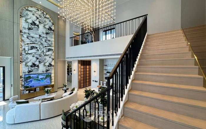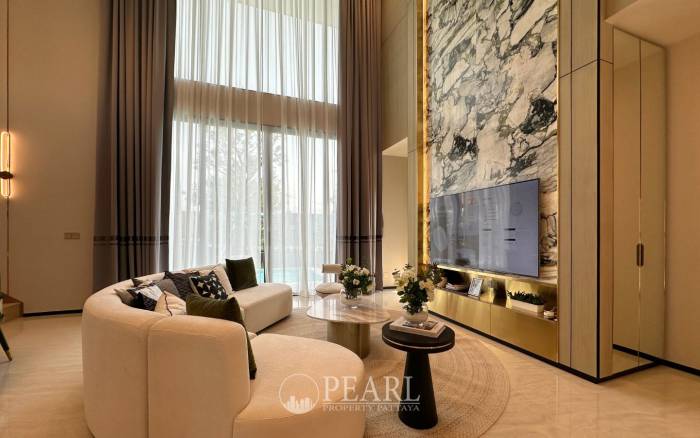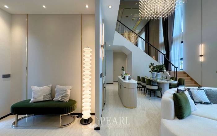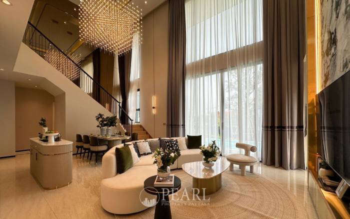 Discover unparalleled luxury at Chieftain by Patta, an exquisite villa nestled within a prestigious development in Nong Pla Lai, Pattaya. This magnificent 4-bedroom, 6-bathroom villa, spanning a generous 396 square meters, offers a sophisticated living experience designed for the most discerning international buyers. Perched on a serene hillock along National Highway No. 36, the property boasts breathtaking panoramic views and a tranquil ambiance, all within a development celebrated for its distinctive Revival Art Deco architectural style. The villa's expansive layout ensures spacious and airy living, prioritizing utmost privacy. Inside, you'll find four well-appointed bedrooms, six elegant bathrooms, two distinct living rooms, a modern kitchen, a dedicated dining area, and practical amenities including a storage room, laundry room, and washing area. A multi-car garage provides ample parking. This prime location in Nong Pla Lai, Bang Lamung, Chon Buri, offers seamless connectivity to Pattaya's vibrant attractions, as well as easy access to Bangkok, Laem Chabang, and Rayong, striking a perfect balance between convenience and peaceful retreat. Chieftain by Patta is currently under construction, with completion anticipated in 2026, promising a brand-new, pet-friendly community. Residents will enjoy an impressive array of amenities including 24-hour security, CCTV surveillance, a covered parking area, swimming pool, state-of-the-art fitness center, lush gardens, a children's playground, jogging track, and a versatile clubhouse with a function room. This exceptional villa is offered unfurnished, including high-quality sanitary ware in all bathrooms and a fitted kitchen, allowing you the freedom to personalize your dream home. The option to add a private swimming pool is also available, further enhancing this luxurious offering. Priced at 18,000,000 THB, this is a rare opportunity to own a piece of Pattaya's most exclusive real estate.