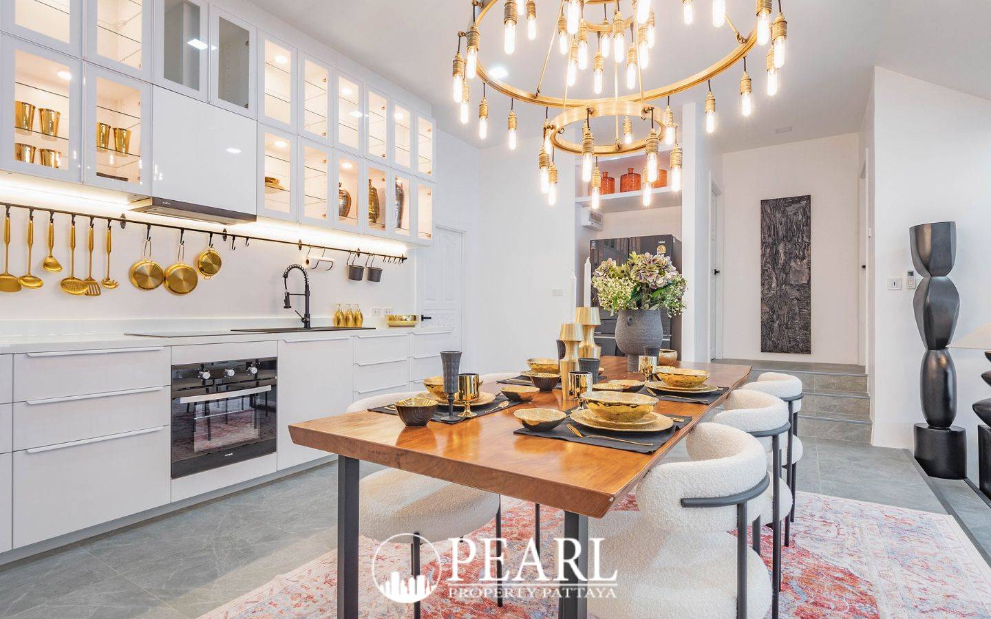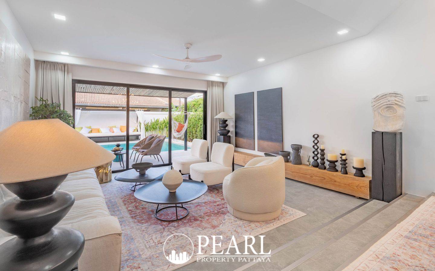 Discover an exquisite opportunity at Srisuk Villa, a charming and tranquil pool villa nestled in a peaceful East Pattaya neighborhood. This meticulously renovated residence offers the perfect blend of privacy and convenience, ideally situated just a five-minute drive from Sukhumvit Road and in close proximity to the esteemed Tara Pattana International School. Such a prime location ensures seamless access to Pattaya's vibrant attractions while maintaining a serene residential atmosphere. Spanning a generous 424 square meter plot, this impressive property boasts 200 square meters of thoughtfully designed usable space. The recently renovated interior showcases a modern and stylish aesthetic, featuring five spacious bedrooms, each accompanied by its own en-suite bathroom, totaling six luxurious bathrooms throughout the home. The villa comes fully furnished, presenting a contemporary European-style kitchen equipped with high-end appliances, a dedicated dining area, a large and bright living space perfect for entertaining, and a convenient laundry room. Step outside to your private oasis, where a stunning swimming pool awaits, surrounded by a dedicated relaxation area—an ideal setting for unwinding and enjoying the tropical climate. Covered parking adds to the convenience and security of this exceptional home. Residents of Srisuk Villa also benefit from excellent communal facilities, including a large swimming pool, beautifully landscaped gardens, and 24-hour security, guaranteeing a safe and peaceful living environment. Offered for sale under a company name, this villa provides a seamless purchase process and is ready for immediate occupancy, presenting an unparalleled opportunity for those seeking a luxurious yet tranquil lifestyle in East Pattaya.