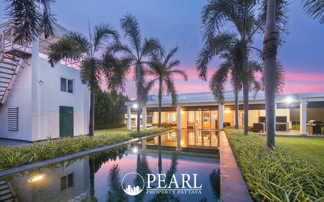 Professional images highlight the spacious garden, private swimming pool, and elegant villa design (alt text: luxury pool villa in Mabprachan Pattaya with large landscaped garden).