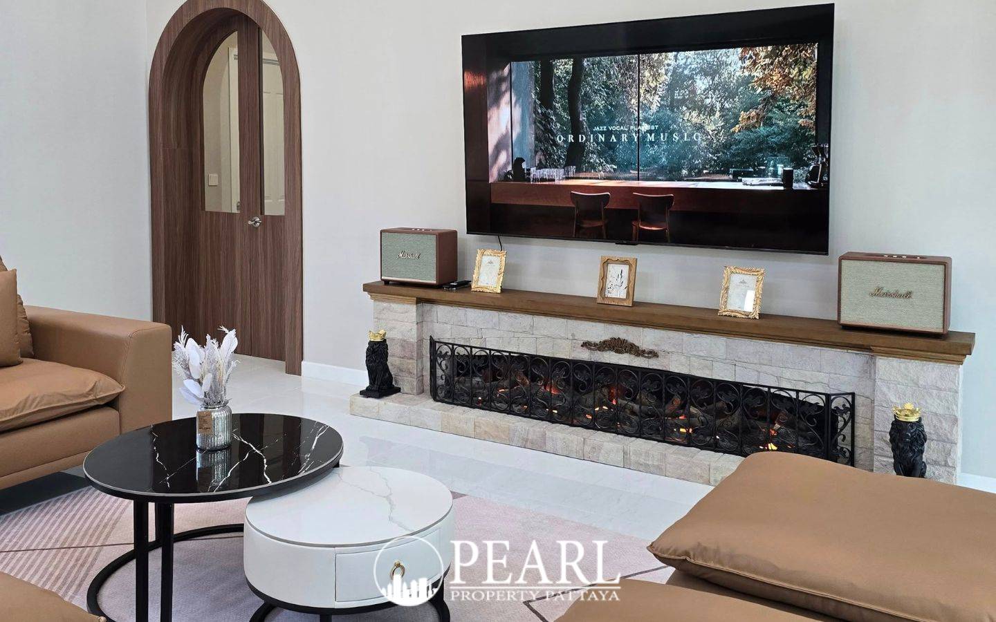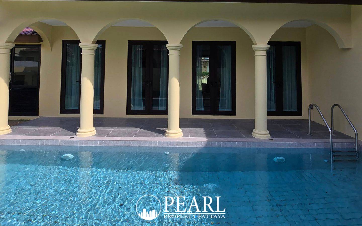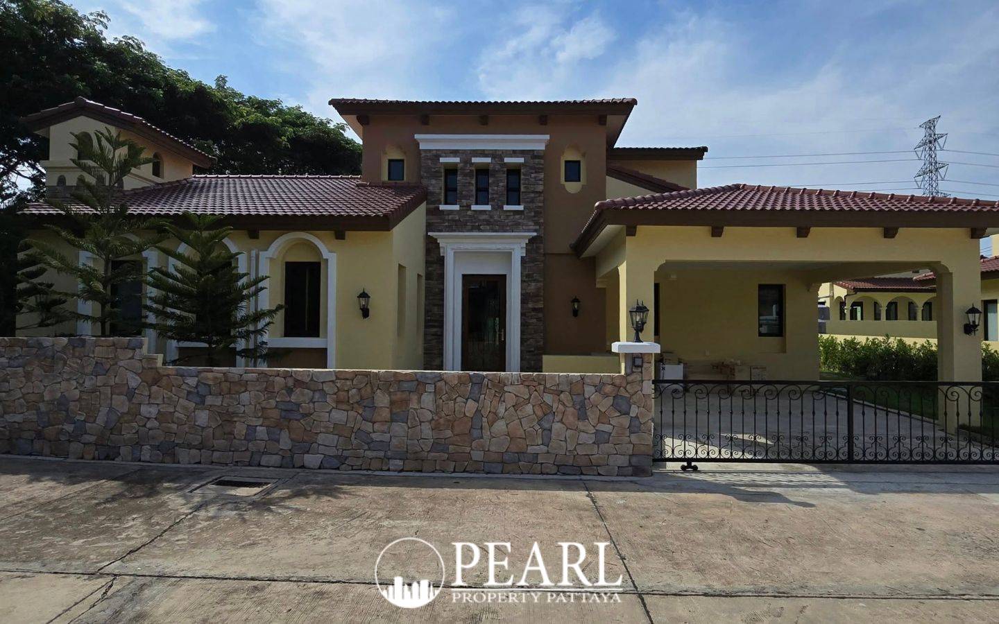 Pearl Property presents this elegant Tuscan-style luxury pool villa in the prestigious Chivani Pool Villa development — surrounded by lush greenery, offering the ambiance of Khao Yai with the convenience of coastal living in Pattaya. Perfectly located right on Sukhumvit Road, just 400 meters from Nong Nooch Tropical Garden and opposite Columbia Pictures Aquaverse Waterpark.