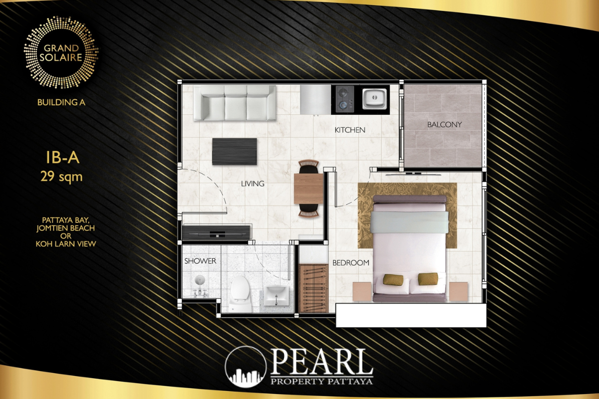 ยูนิตขนาด 29 ตารางเมตร แบบ 1B-A ตั้งอยู่บนชั้น 28 มาพร้อมห้องนอน 1 ห้อง และห้องน้ำ 1 ห้อง ออกแบบพื้นที่ใช้สอยอย่างชาญฉลาด พร้อมครัวบิวท์อิน และการตกแต่งทันสมัย เหมาะสำหรับอยู่อาศัยหรือปล่อยเช่า พร้อมวิวทะเลและเมืองพัทยาแบบเต็มตา