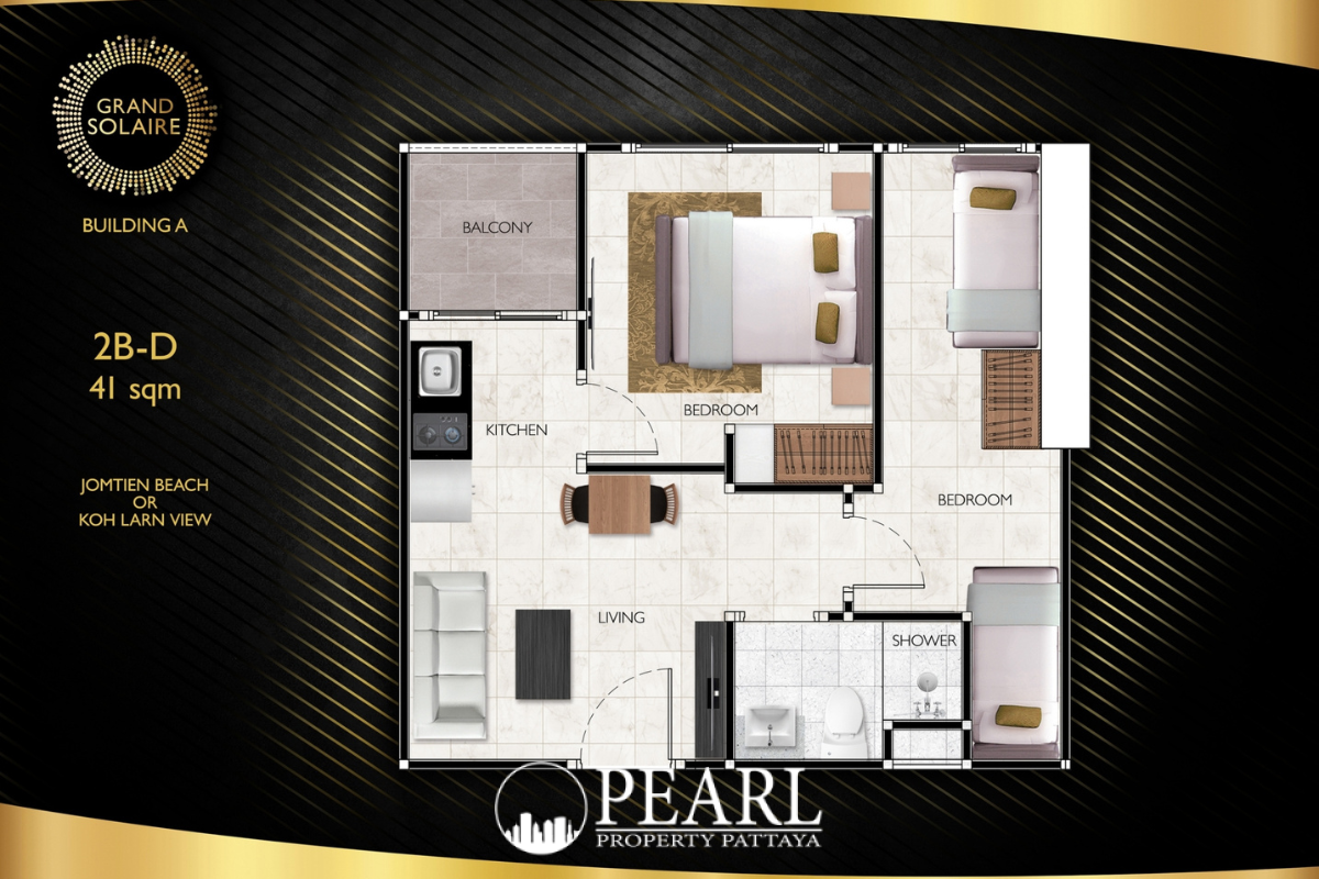 ห้องชุดนี้ออกแบบอย่างลงตัว ประกอบด้วย 2 ห้องนอน 1 ห้องน้ำ เหมาะสำหรับพักอาศัยส่วนตัว ปล่อยเช่า หรือใช้เป็นที่พักตากอากาศ จุดเด่นอยู่ที่วิวทะเลและเกาะล้านอันงดงาม มองเห็นได้ชัดเจนจากภายในห้อง